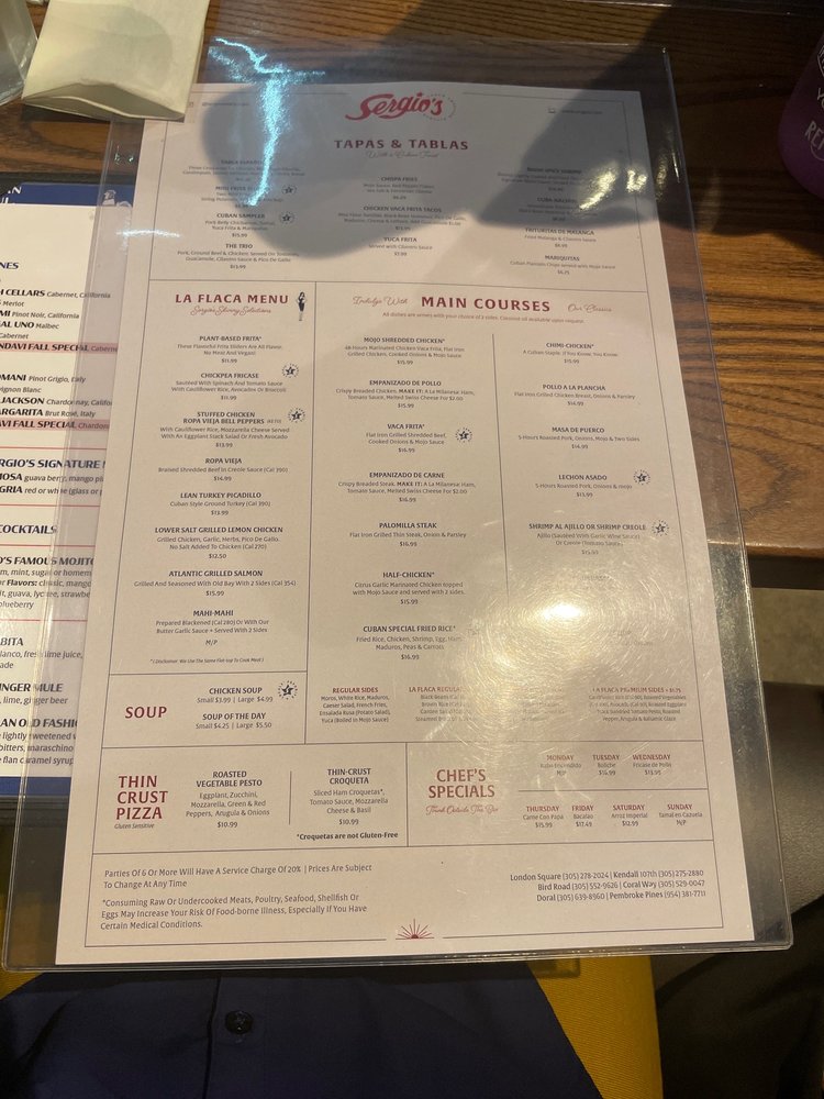 Introducing the menu at Sergio’s, a top-rated Cuban restaurant in Pembroke Pines, FL. Offering a variety of dishes for breakfast, brunch, lunch, and dinner, Sergio’s is a must-visit for Cuban cuisine lovers. From traditional favorites like Vaca Frita and Pan Con Lechon to La Flaca low-calorie options, there is something for everyone. The menu features lunch specials under $15, weekend BBQ specials, and plant-based options, ensuring a diverse selection for all dietary preferences. Customers rave about the flavorful dishes, with highlighted mentions of the Vaca Frita and Empanizado de Pollo A la milanesa. With ample parking, a classy yet casual ambiance, and attentive service, Sergio’s impresses both first-time visitors and regulars. Be sure to try their famous Ropa Vieja next time you dine in!
